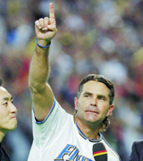 新庄…さすがに知らない人はいないと思いますが、阪神→メジャー→日本ハムと、色んな球団に所属した経験をもつ球界屈指のエンターテナー。「野球は嫌い」とか「もう引退します(当時まだ20代)」とか「これからはパ・リーグです」とか「(メジャーでの)最初の打席でヒット打てそうな気がする(実際打った)」とか「オールスターでMVP獲ります(実際取った)」とか「最後の年(今年)は優勝します(実際優勝)」とか…。数々の名言と実績を残しています。